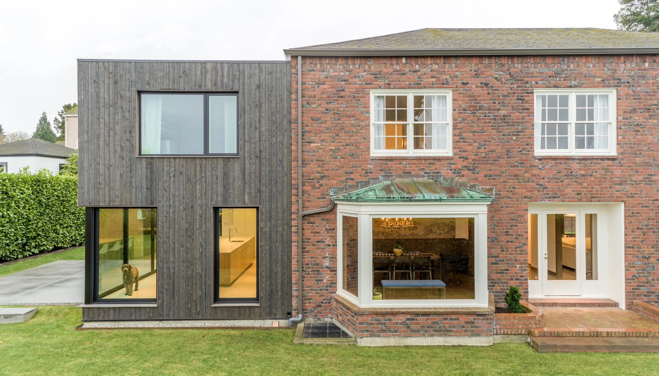 The east facade was blown open and replaced with a glass enclosure to create strong visual and physical connections to the yard. White cabinetry is fully integrated into the edges and walnut portals create a transition between the modern kitchen and the wood tones of the original home. A wide island anchors the room and an equally wide set of sliding doors opens the family gathering space to the yard and patio. The exterior was reclad with dark stained tight knot channel siding. This material references back to the design of the first collaboration and bridges the tradition of the original brick home with the scale and openness of something new.