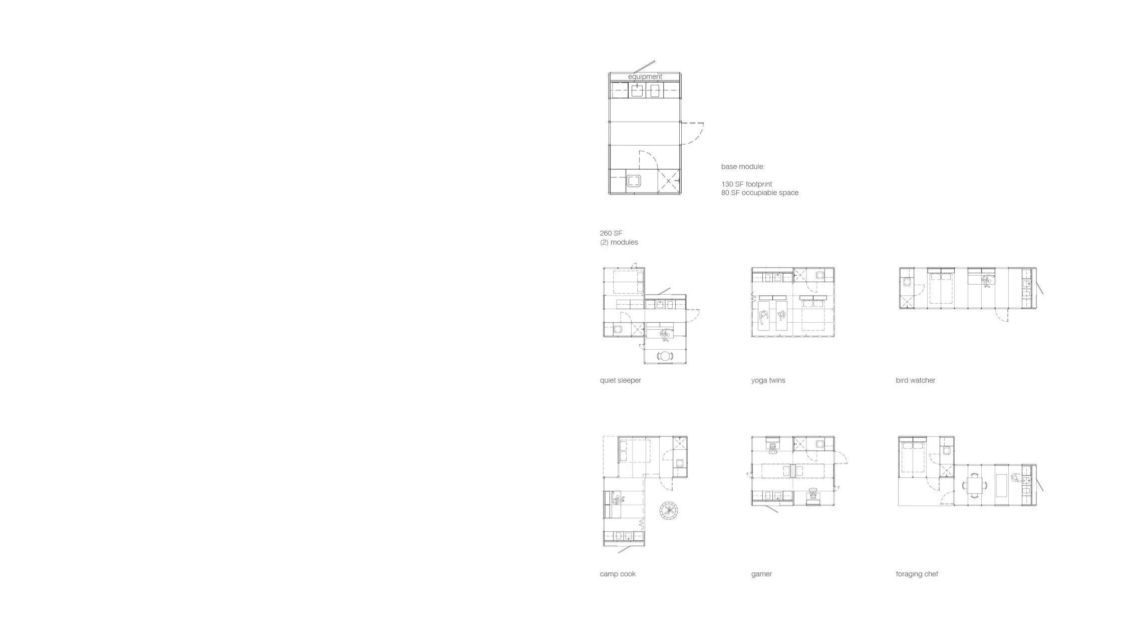 Modular need not lead to sameness. A component derived system can be flexible in order to create the particular. Some occupants might thrive in a singular space visually connected to the environment while another seeks spaces that are inward focused / separated to accommodate differing daily routines and schedules.