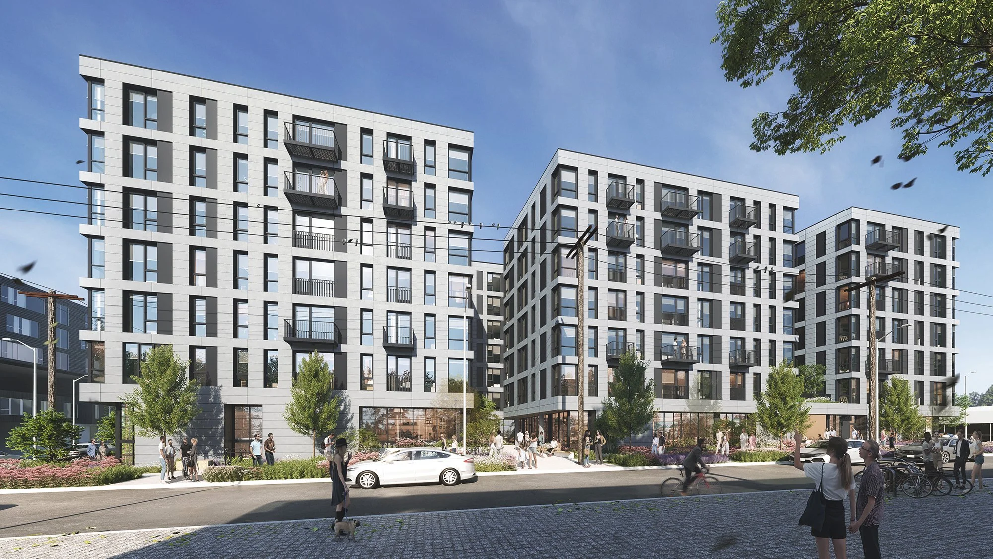 The proposed mixed-use project responds to power line setbacks and three distinct street frontages by expanding public space with a landscaped territory that combines pedestrian amenity, access to commercial spaces along the south and west sides, and an active west facing residential entry courtyard at the heart of the development. A second landscaped courtyard along the west edge, accessed from level 2, carves into the block with subtle angled inflections to provide additional light and air for the dwellings. The building form maximizes the number of dwellings with exposure to the streets and creates a diverse unit mix leading to articulated façade variation within a cohesive enclosure system. The eastern alley edge allows for tidy distribution of building services and access to below grade parking. Residents will enjoy roof top deck amenity spaces with views south the Mount Rainier and north to the downtown skyline.
